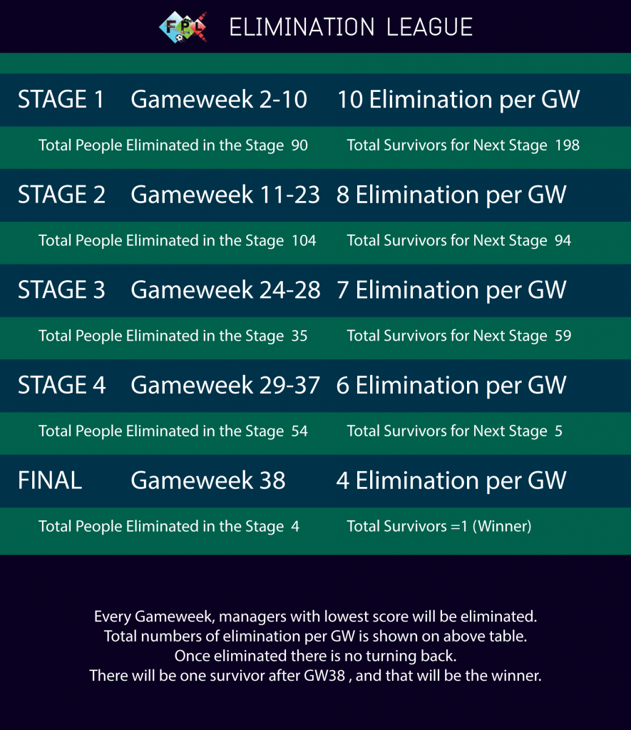 Every Gameweek, manager with lowest gameweek score will be eliminated. Survive until the last to be the winner.